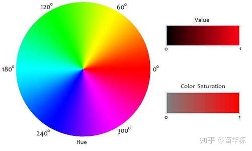 虽然R的值增大了,但是G/B值的大小也会影响混合的颜色,导致变成了灰色。所以RGB三个值,牵一发而动全身,如果想在RGB空间找到红色范围是非常困难的,这就需要将色彩从RGB空间转换到HSV空间(如下图,这里不做详述),在HSV空间红色的范围可以很容易的表示出来。