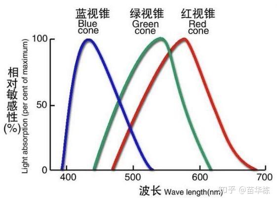 通过调整三种颜色的配比,就能混合出各种颜色。为什么我们经常通过RGB空间来表示所有的颜色呢?因为人类有三种视锥细胞,而这三种视锥细胞最敏感的波长接近于红/绿/蓝(如下图)。所以任何颜色对于大脑来说,都是这三种视锥细胞电信号的混合作用。这也是我们使用RGB空间的生物学基础。