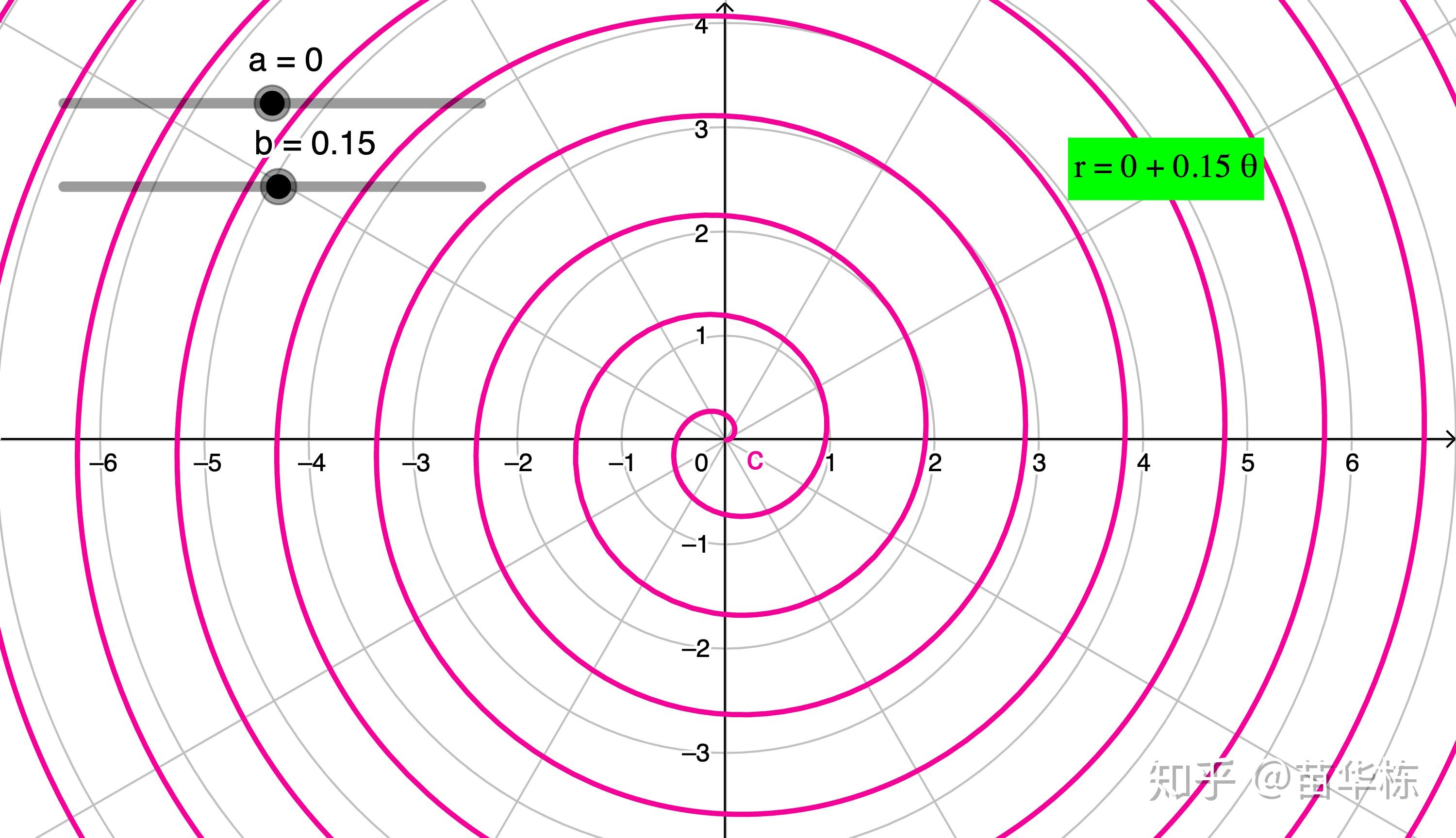 我们来看一下阿基米德螺线(如下图),当一点P沿动射线OP以等速率向外运动的同时,这射线又以等角速度绕点O旋转,点P的轨迹称为“阿基米德螺线 。这种螺线的每条臂的间距永远相等于