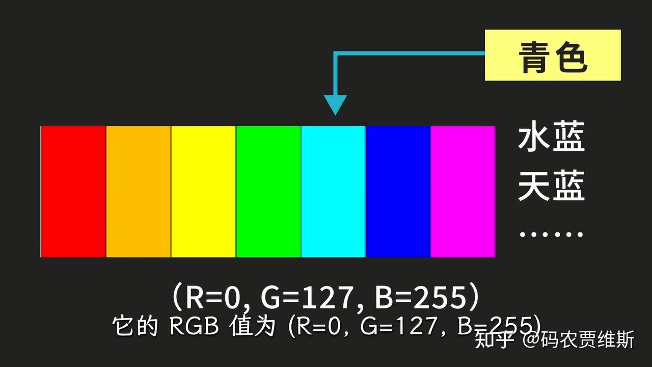 青色 RGB 值为 (R=0,G=127,B=255),会吸收全部的红色和一半的绿色