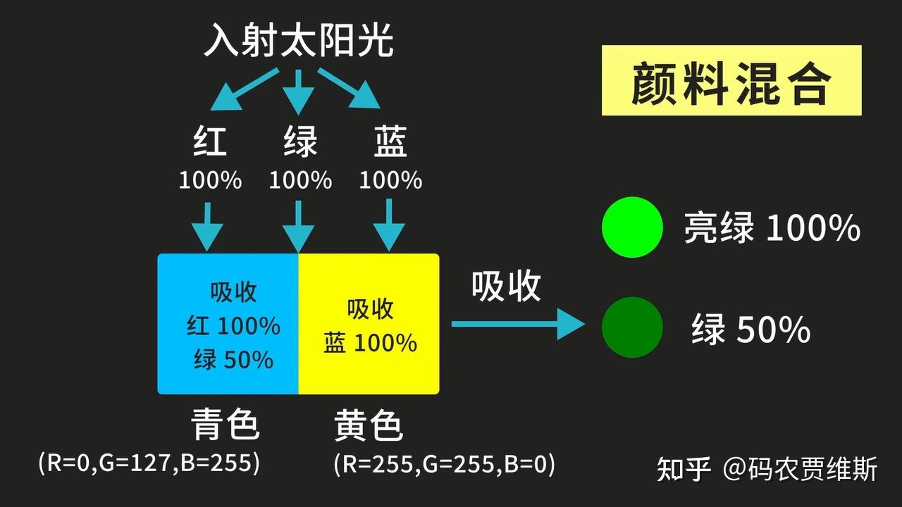 而颜料的颜色则是通过吸收环境中的白色漫反射光中的一部分